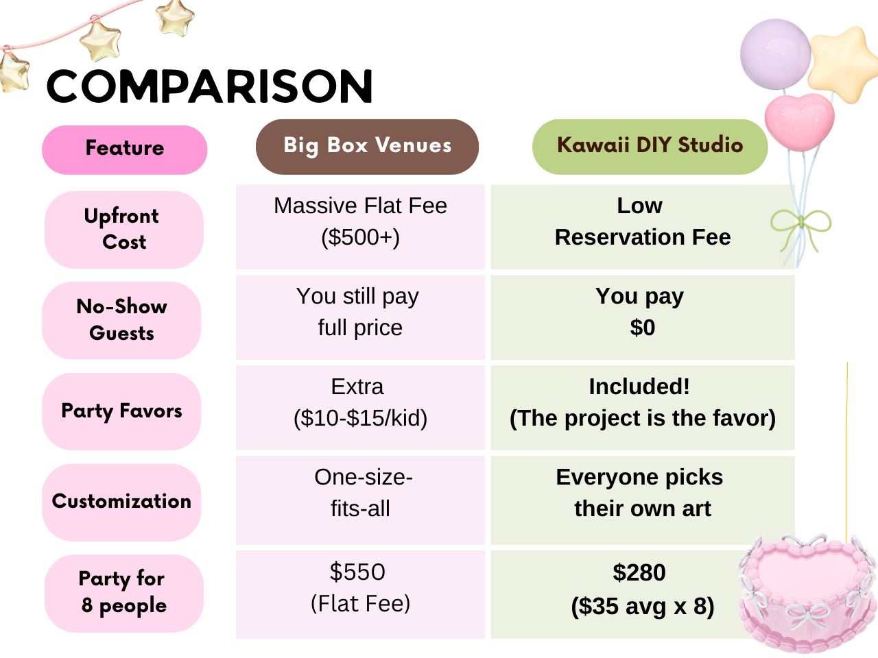Tired of "Flat Fee" packages that force you to pay for guests who don't show up? At Kawaii DIY Studio, we believe you should only pay for the creativity that actually happens!